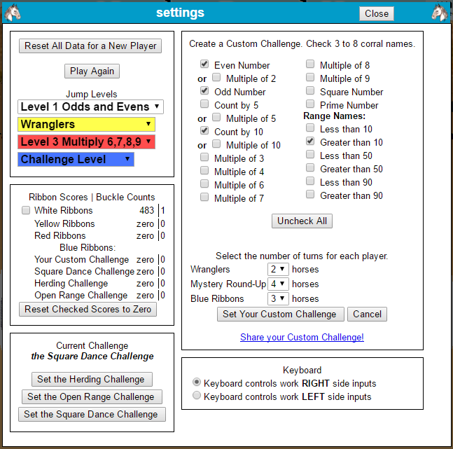 You can also decide how many turns each player gets in each Challenge activity: Wranglers, Mystery Round-Up and Ribbons.